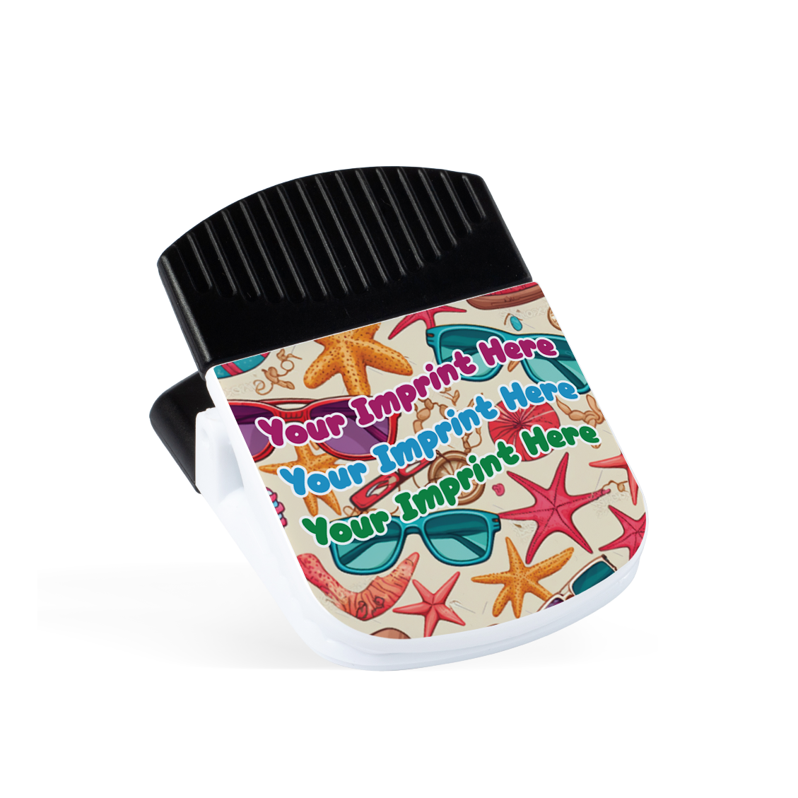The magnetic clip is perfect as a chip or snack bags clip. It features a heavy-duty, spring-loaded hinge and a strong magnet on the back for added versatility. Imprinted, assembled, and packaged in the USA Product Size: 2L x 1.4W x 2.9H Standard Production Time: 5 business days upon credit approval. MSRP :  $4.89