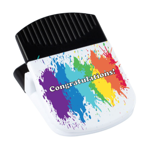 The magnetic clip is perfect as a chip or snack bags clip. It features a heavy-duty, spring-loaded hinge and a strong magnet on the back for added versatility. Imprinted, assembled, and packaged in the USA