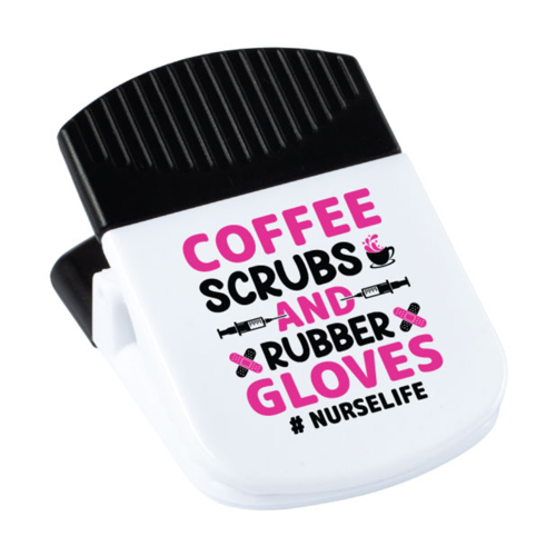 The magnetic clip is perfect as a chip or snack bags clip. It features a heavy-duty, spring-loaded hinge and a strong magnet on the back for added versatility. Imprinted, assembled, and packaged in the USA Product Size: 2L x 1.4W x 2.9H Standard Production Time: 5 business days upon credit approval. MSRP :  $4.89